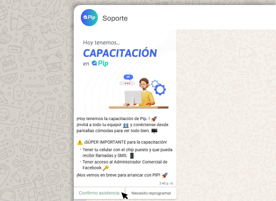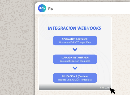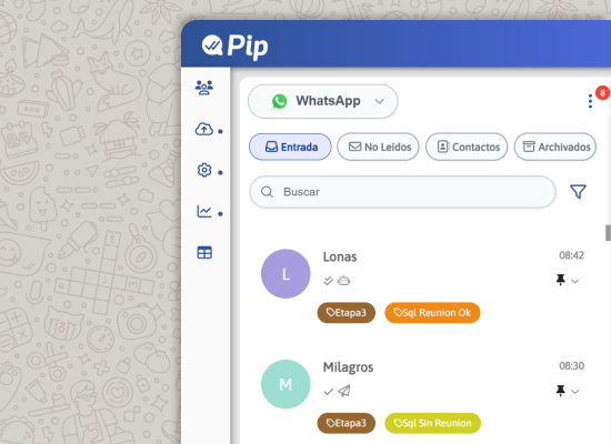 Conectá tu sistema directamente a Pip para centralizar toda la información de tus clientes y automatizar procesos desde un solo lugar. Esto permite que tus conversaciones de WhatsApp estén sincronizadas con tu CRM, evitando la duplicación de datos y facilitando el seguimiento de cada cliente.