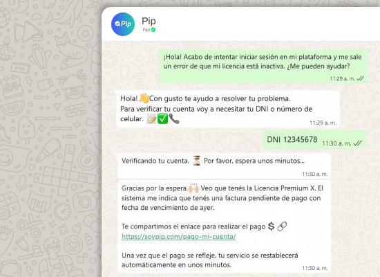 Automatizá la atención de tu negocio con respuestas instantáneas, precisas y disponibles las 24 horas. La IA de Pip entiende las consultas de tus clientes y brinda información clara, mejorando la experiencia y reduciendo el tiempo de respuesta.